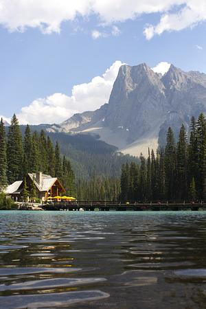 cilantro cafe shot from water level view on emerald lake with mount burgess/walcott peack in the background