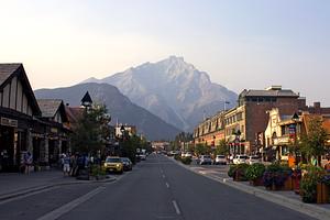 looking down banff ave towards cascade mountain during golden hour a shot down the main avenue in Banff standing in the middle go the left street near sunset