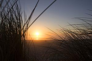 sunset photo on twin rocks beach Oregon, a couple is cuddling on a log between the reed